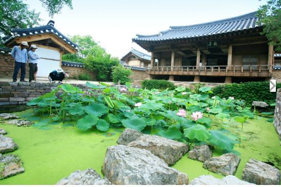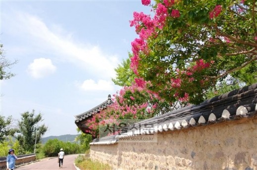 ▲ 두들마을 전경. 이문열의 집필 및 후학양성 공간인 광산문우 담벽에 백일홍이 활짝 피었다