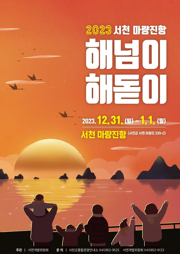 28일 서천군에 따르면 오는 31일부터 내년 1월1일까지 마량진항에서는 ‘해넘이 해돋이 행사’가 열린다. 소원 패 달기, 고구마·가래떡 구워 먹기 등을 해 볼 수 있고, 초청 가수와 지역 동아리 공연도 준비됐다. 떡국 나눔, 새해맞이 불꽃 쇼 등 이벤트도 마련된다.