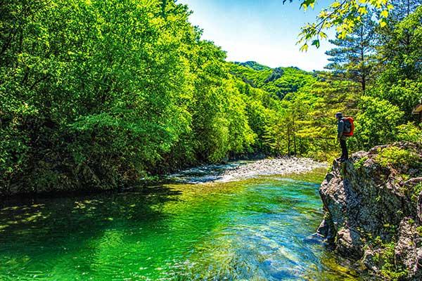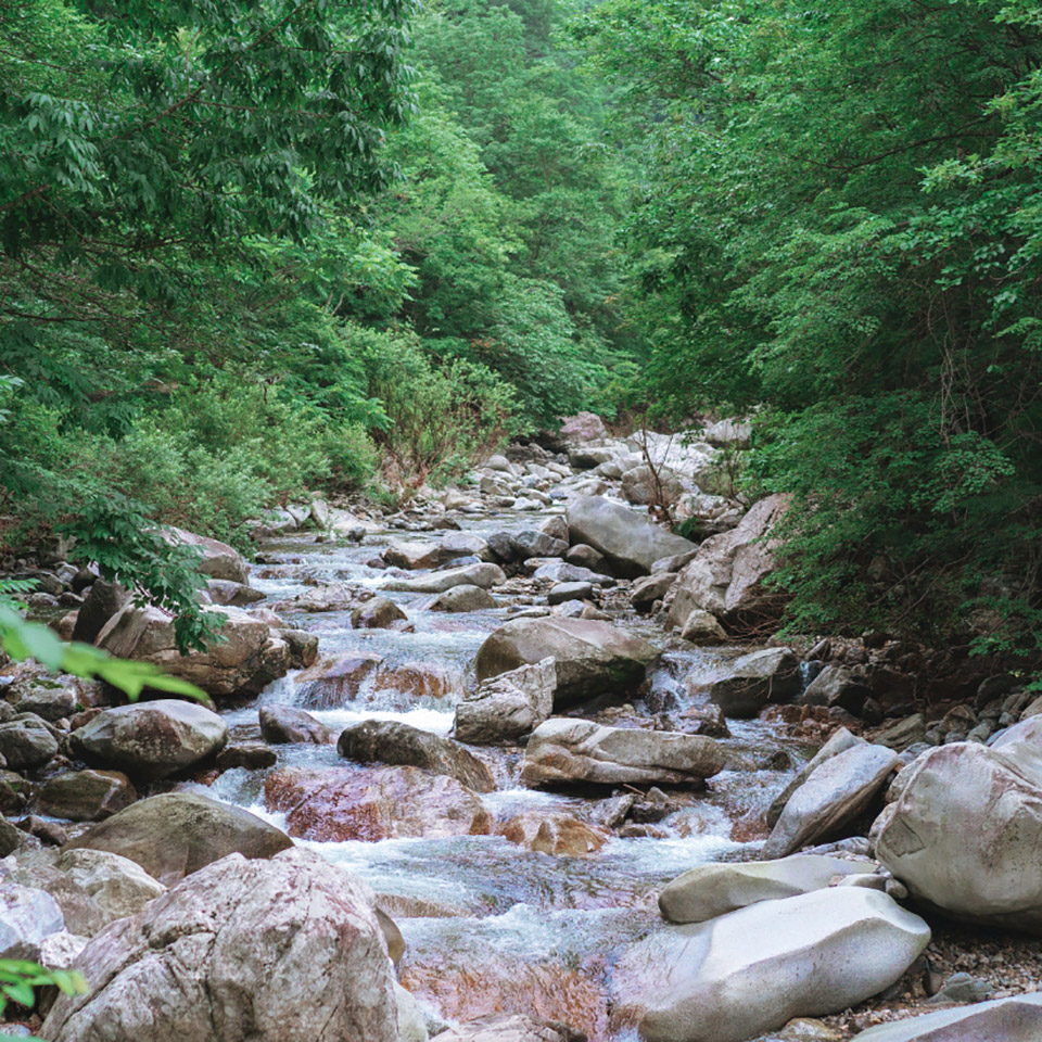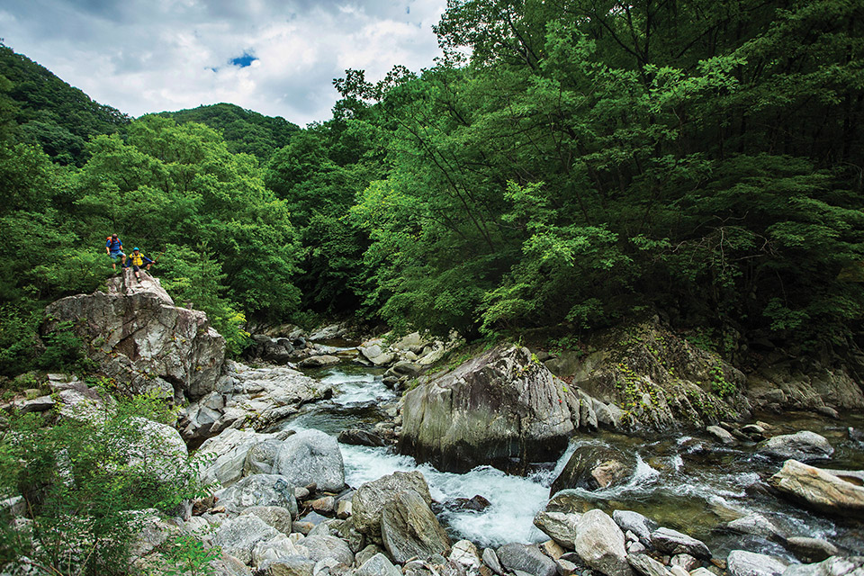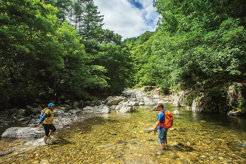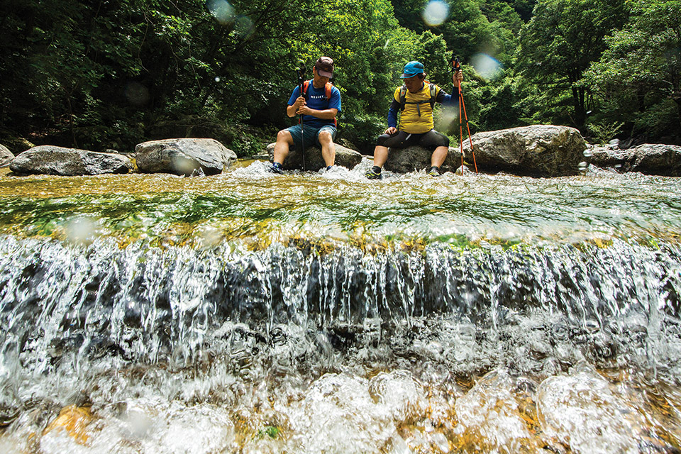차가운 계곡물에 수시로 몸을 담금질하기 때문에 아쿠아 트레킹화를 챙기는 것이 좋다.