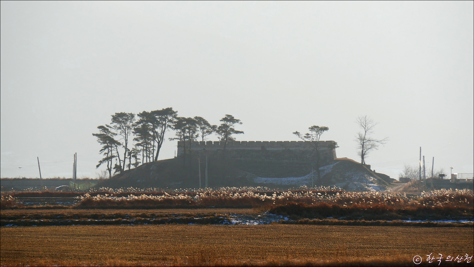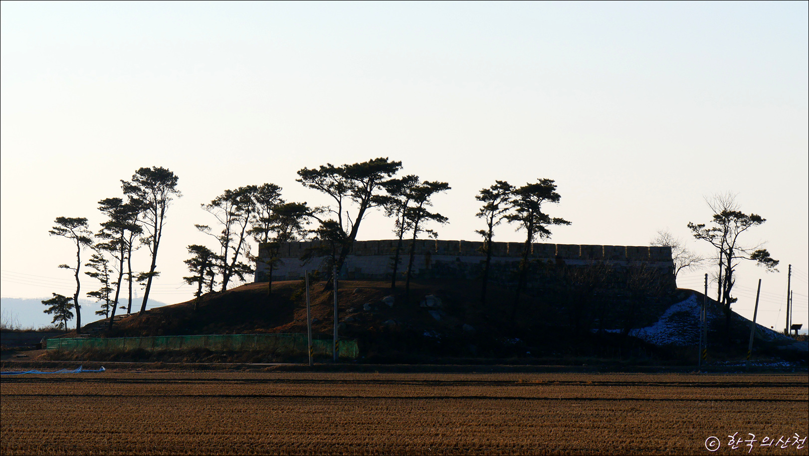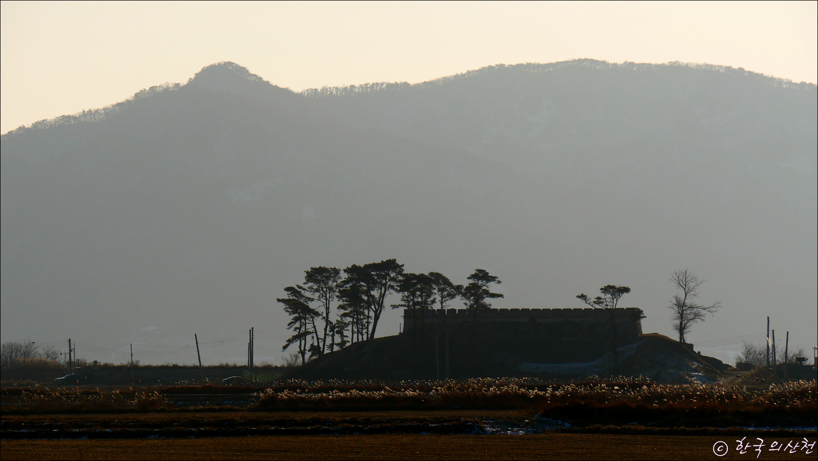 ▲ 들판 끝자락에 자리한 계룡돈대 그 뒤로 바다 건너 석모도의 해명산이 산그늘을 지고 우뚝 서있다