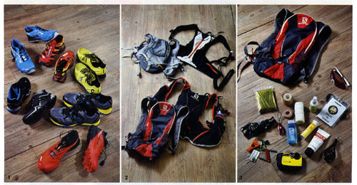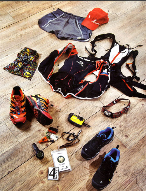 야전을 달리다 보면 위급 상황이 생길 수 있다. 그때 응급처치 키트들이 필요한데 그런 용품들을 담을 수 있는 작은 배낭(10리터 정도가 적당)은 필수다. 계절에 따라 비가 올 수도 있으니 우비와 방풍재킷, 상황에 따라서는 가볍고 부피가 작은 다운재킷도 필요하다. 트레일 러닝화는 기본이며 여분의 양말, 장갑, 모자, 헤드랜턴, 비상용 깜박이, 비상식량(물 포함), 고글, 화장지, 신분증, 비상금, 휴대폰 배터리, 구급약 등을 챙겨 가면 도움이 된다.