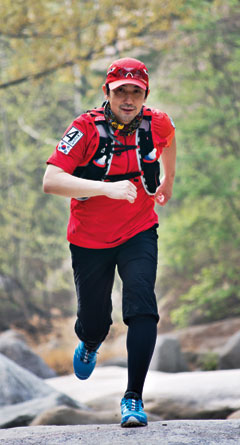 트레일 러닝 전문가 유지성씨가 장거리 레이스에 필요한 장비를 착용하고 달리는 모습.