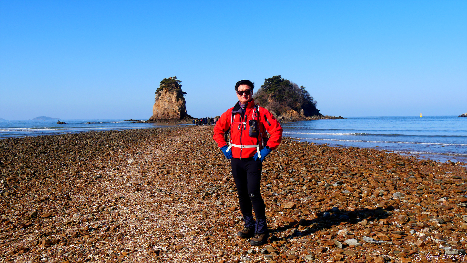 꽃지해변을 대표하는 할미 할아비바위. 마침 썰물시간이라 많은 인파가 할미할아비 바위로 걸어 들어가고 있다