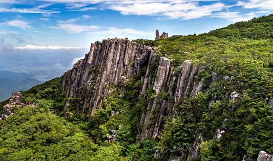 광주 무등산국립공원 내 주상절리대인 입석대 전경. 하늘을 향해 솟아오른 돌기둥이 무리를 이룬 이곳은 2018년 4월 유네스코의 세계지질공원에 지정됐다. 뉴시스