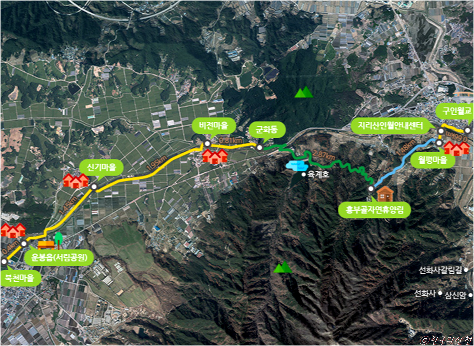운봉읍 – 서림공원(0.2km) – 북천마을(0.8km) – 신기마을(1.1km) – 비전마을(2km) – 군화동(0.8km) – 흥부골자연휴양림 (2.9km) – 월평마을(1.5km) – 구인월교(0.2km) – 인월안내센터(0.4km)