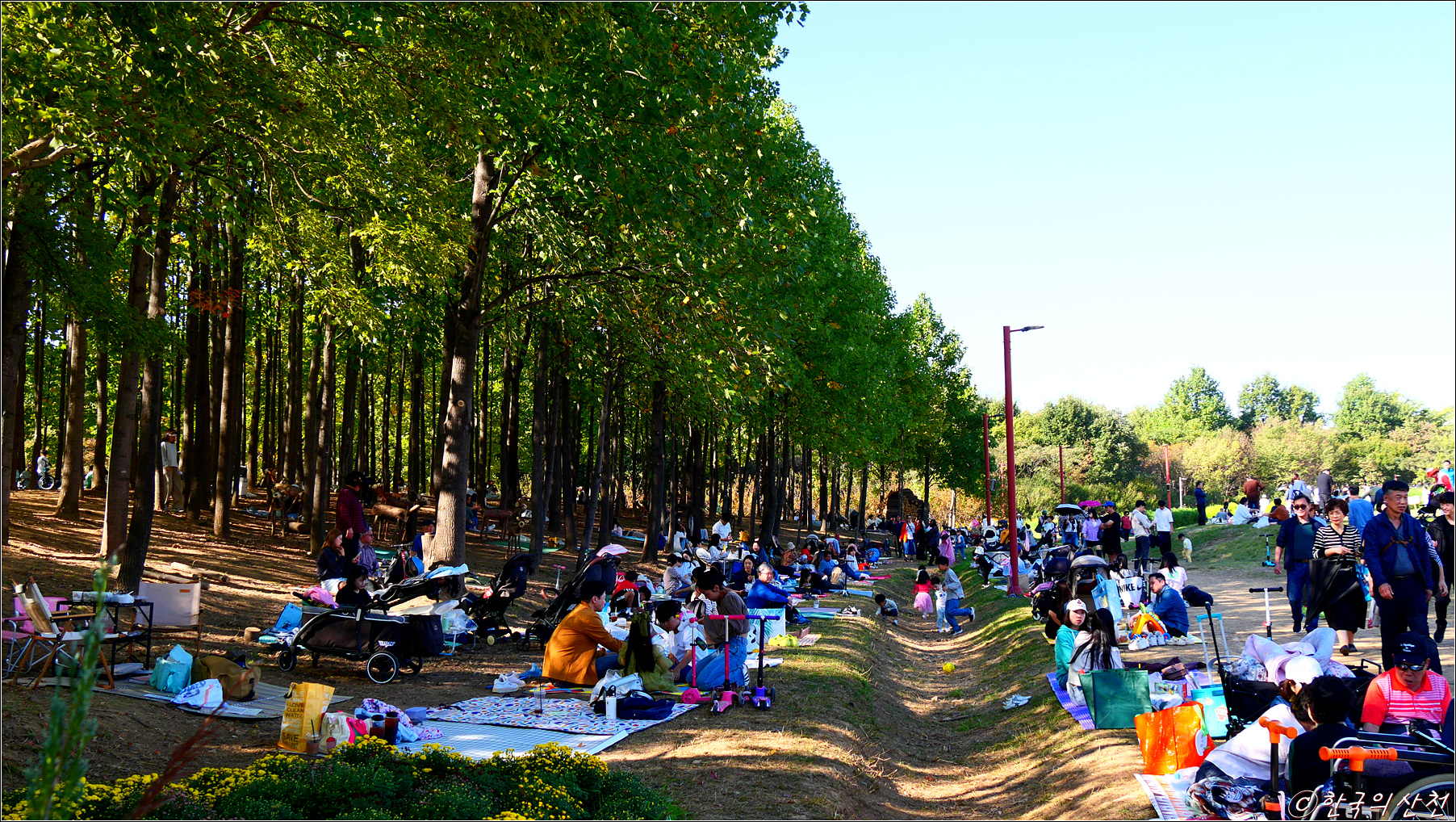 공원이 넓어서 쉴 곳이 많음. 돗자리, 깔개 간단한 먹거리 준비해서 휴식하기 좋음.